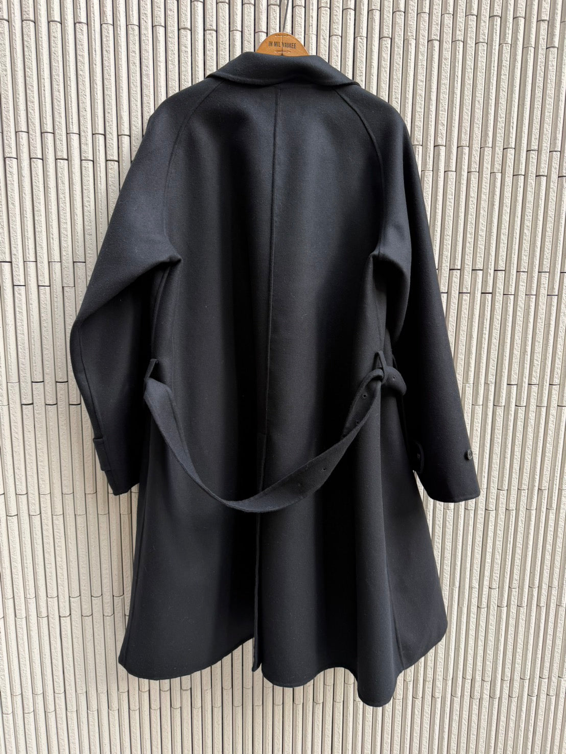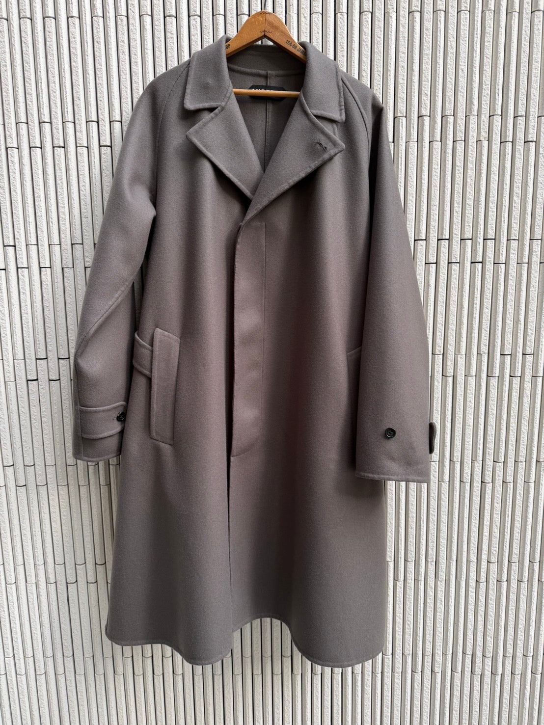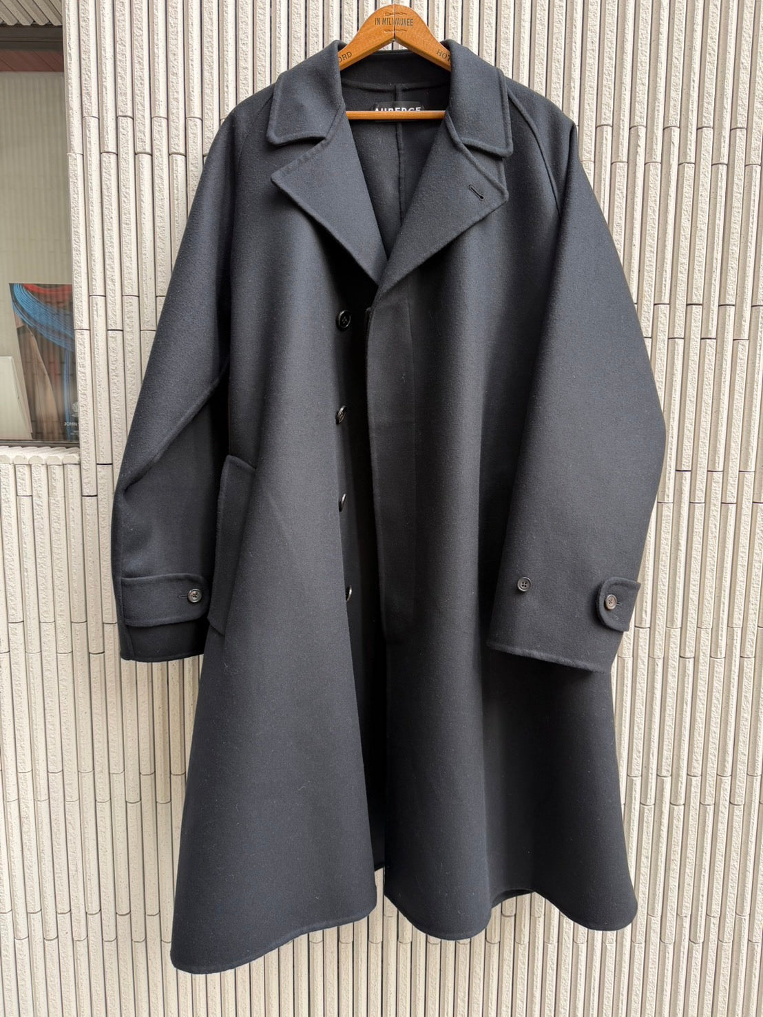 1枚仕立ての無双(リバー縫製)生地の良さをダイレクトに伝える究極技術。本縫いミシンをかけることはその部分を固く絞めてはぎ合わせる事であり、直線的な美しさはあるが、素材の良さ(柔らかさ、オチ感)を表現しにくくなる。往年のシャネルスーツはミシンを使わず、全て手縫い、手まつりで仕上げることでの伝説である。総手まつりは現実的ではないので、極力、糸で縫い目を締め上げない特殊な手まつりミシンとハンドをミックスしながらこのELYを完成させた。裏地を必要としないこの仕様は素材感を皮膚にダイレクトに伝える。AUBERGE定番の一枚袖ラグランコートは肩周りを綺麗にフィットさせ、流れるAラインシルエットを実現。