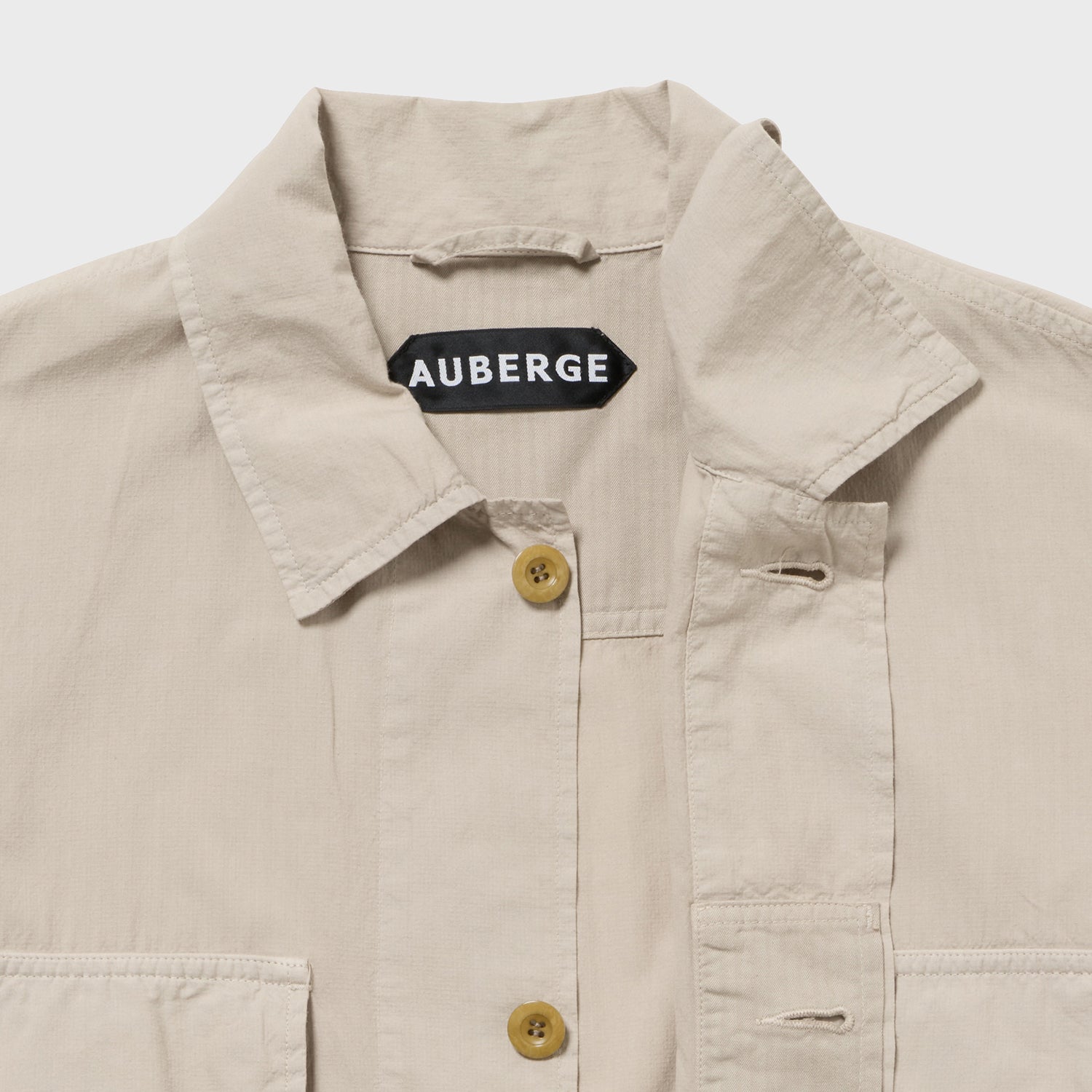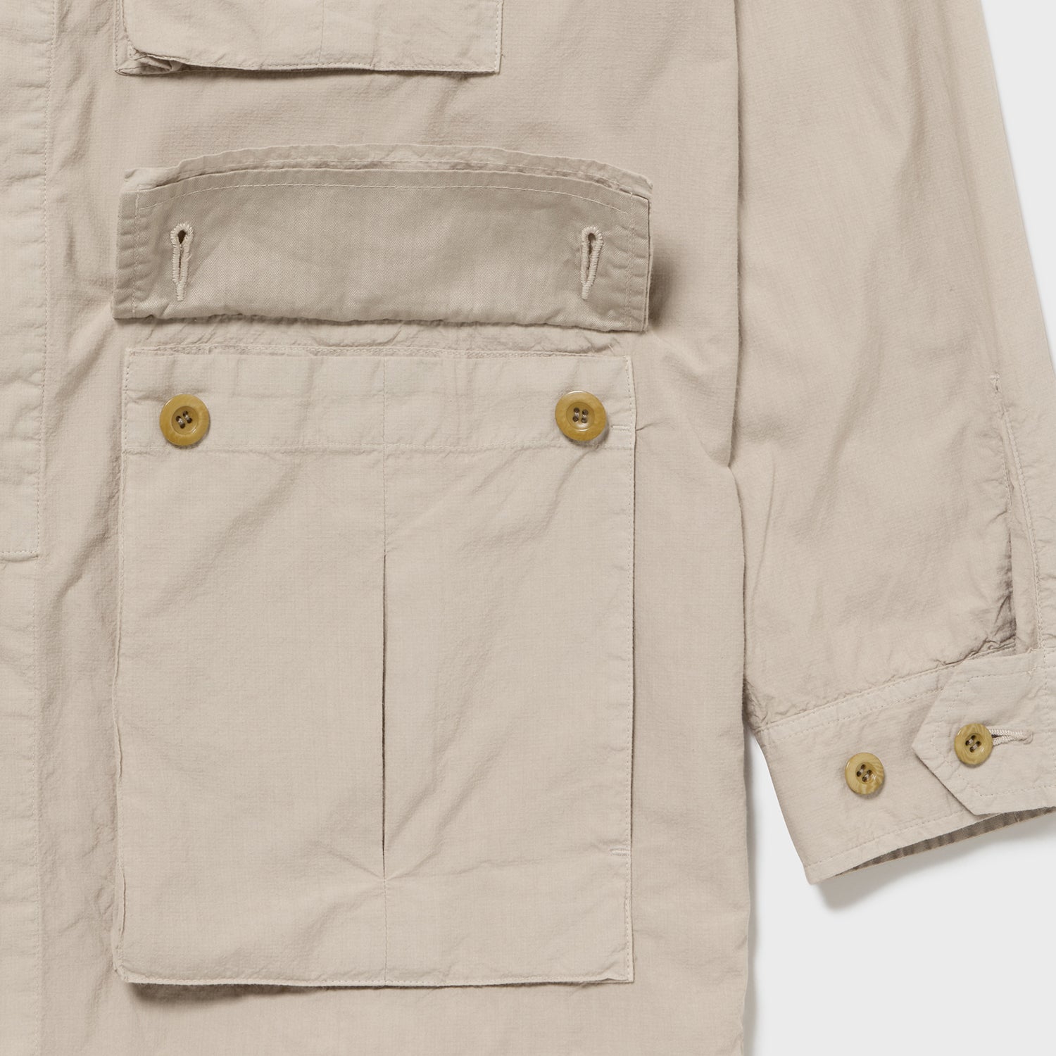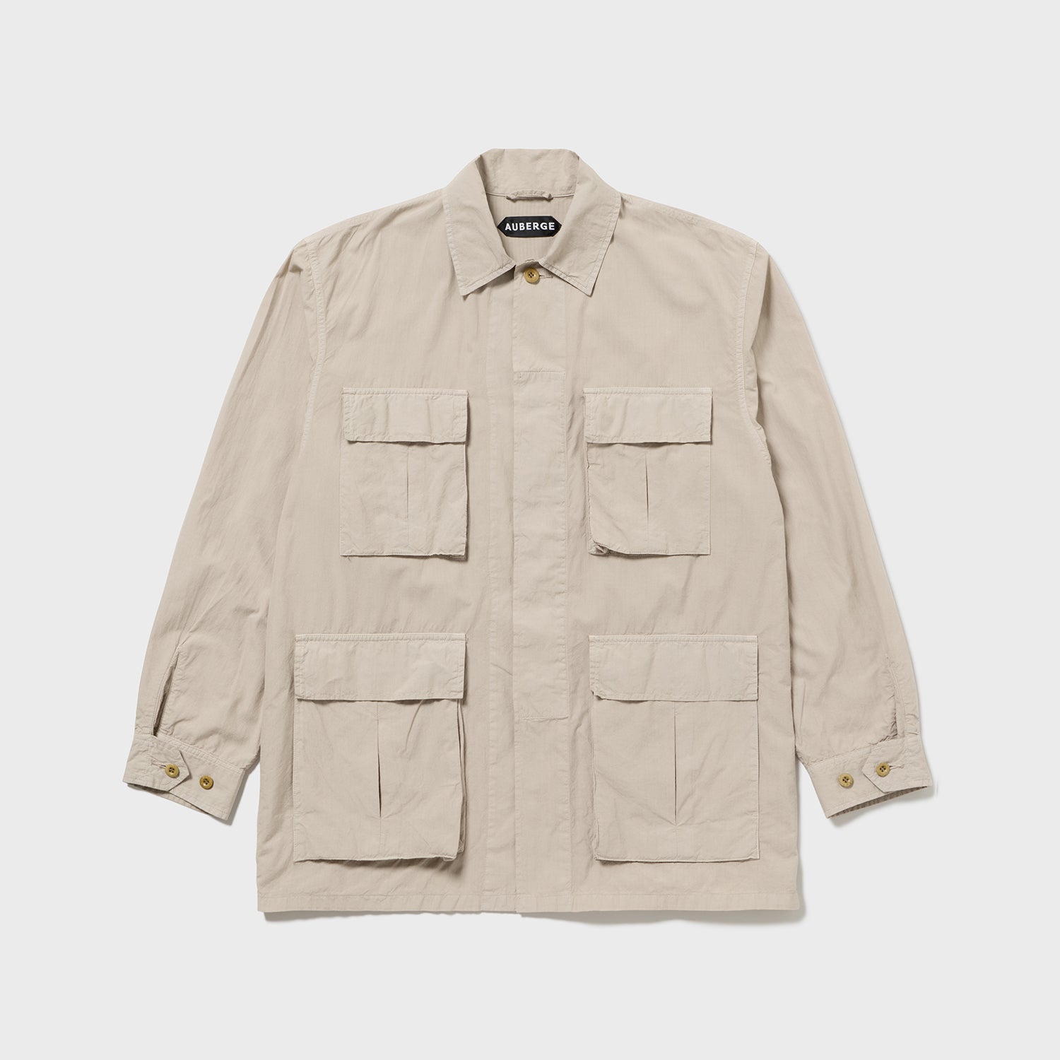 当初のイメージでは、ベトナム戦争期のジャングルファティーグがマッチすると考えましたが、輩感が強めに出るため、今回はカラー・デザインともに少しナイーブなシャツ生地で作ったライトミリタリーを目指し、80年代の海兵隊4パッチJKに仕立てました。