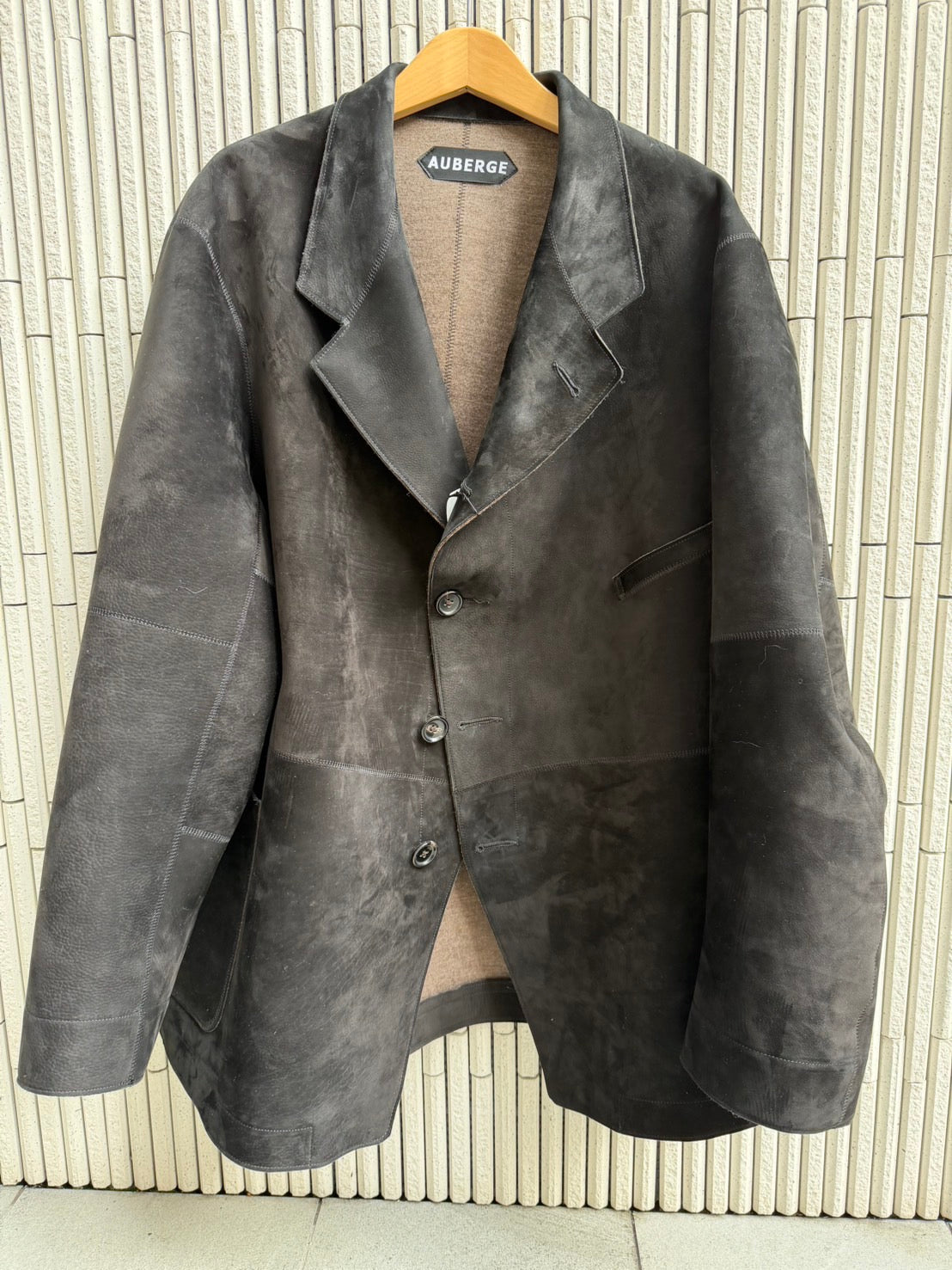 日本に3工場しかない縫い代0で縫い合わせる特殊ミシンで仕立てたAUBERGE定番アジェ型19世紀サックコート。レザー縫製の世界で前例のない技法。もはや大人は固く、重いレザーは選びにくいが柔らかすぎるシープやカーフではいわゆるのハイブランドレザーになってしまう。そこで柔らかさの究極、ベビーカーフに尾州のウールスムースをボンディングで柔らかさがあるのにハリがある状況を作り、分量の入ったヴィンテージサックコート(ジャケット)でえも言えぬモード感を演出、大人も納得の軽さ柔らかさも併せ持つ1着に仕上げた。