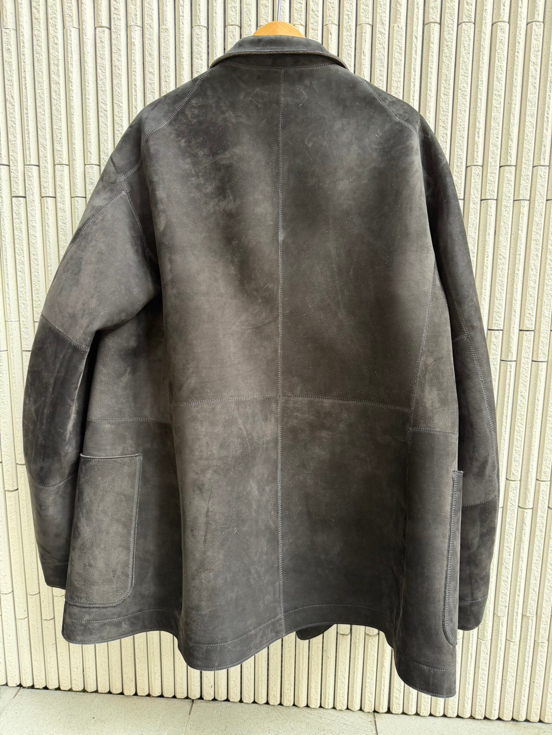 生後3ヶ月のカーフにヌバック(銀面に弱起毛をかける)加工を施し、ヴィンテージテイスト溢れるベージュトップ糸によるウールスムースをボンディングしました。 これは世界的にも類を見ない縫い代0で縫製する特殊ミシンを使うためのデザインでもある。